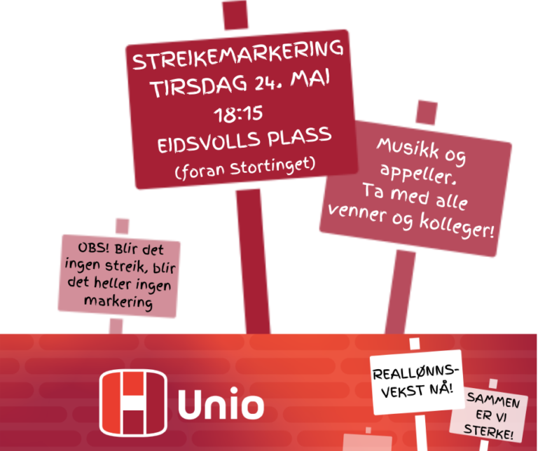 Tirsdag 24. mai, kl. 18.15, vil vi samle så mange av Unios medlemmer som mulig fra hele Oslo på Eidsvolds plass (foran Stortinget). Det blir musikk og appeller. Møt opp med kollegaer og venner