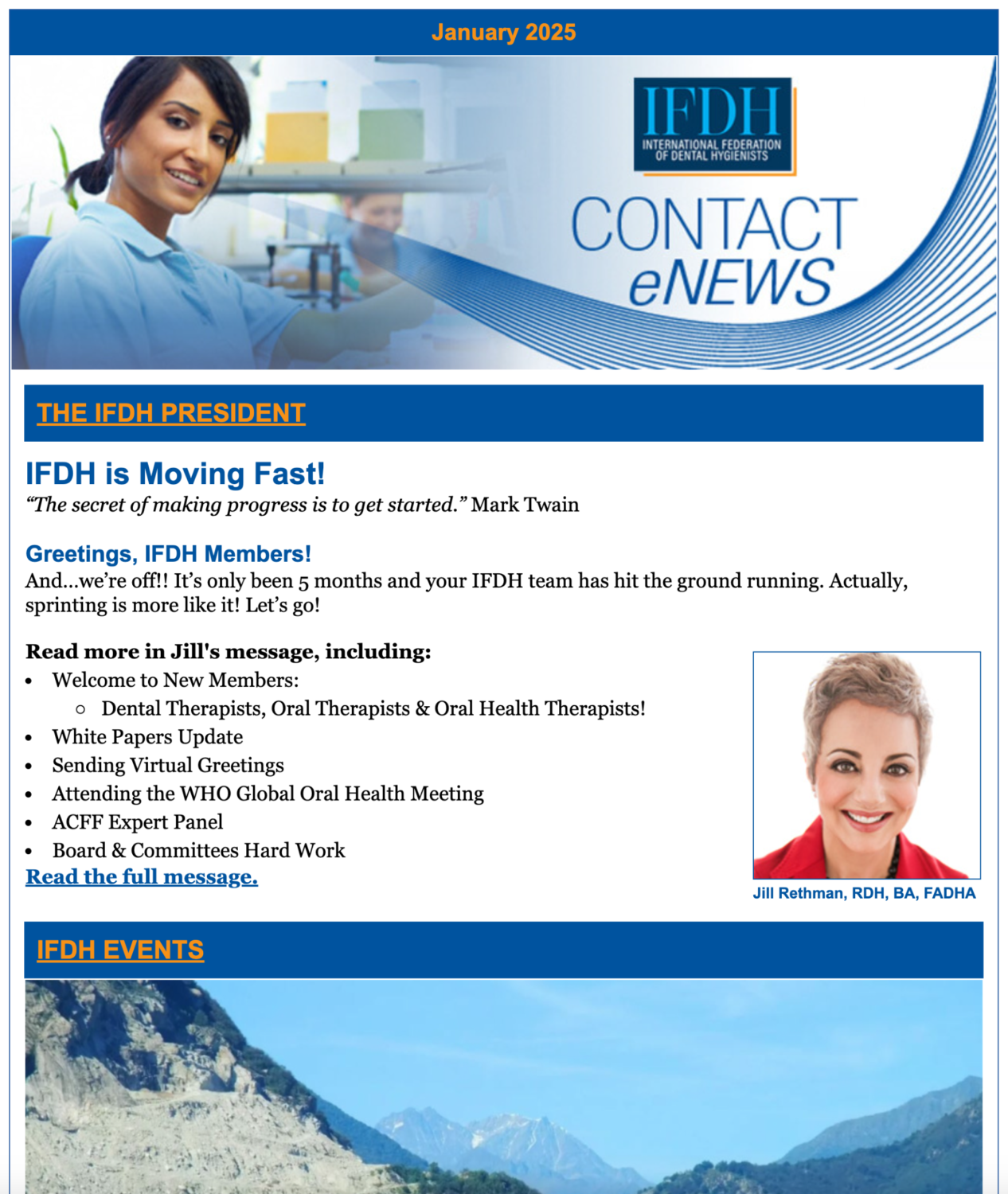 Hilsen fra IFDH sin nye president Jill Rethman, info om kongresser og arbeid som skjer imedlemslandene.